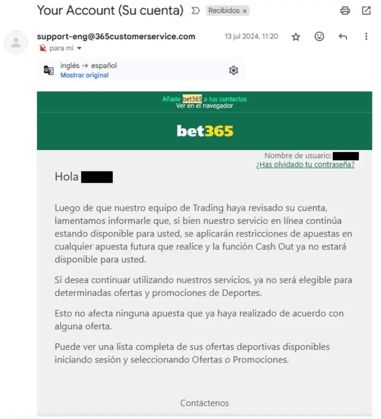 Uno de los peores aspectos que he encontrado en Bet365 son sus limitaciones muy drásticas en el monto a apostar cuando el usuario comienza a ganar dinero.  Si bien abrí mi cuenta en mayo 2022, la mayor parte de mis apuestas en Bet365 fueron realizadas durante los meses de junio y julio de 2024.  El 13 de julio de 2024 me llegó el correo de la imagen de abajo, donde se me informa de la aplicación de restricciones en el monto a apostar en futuras apuestas.