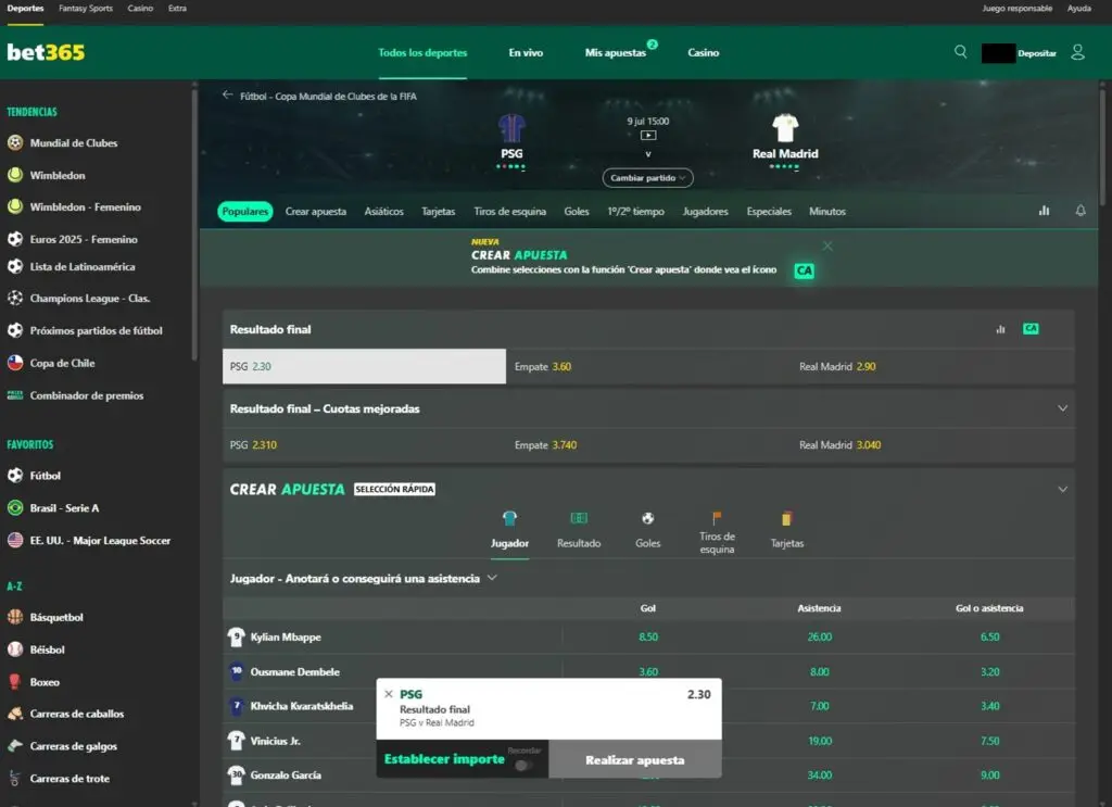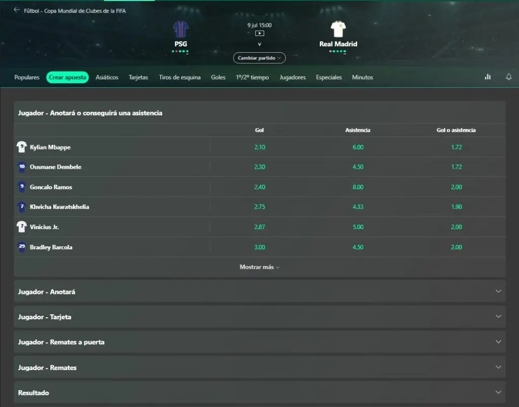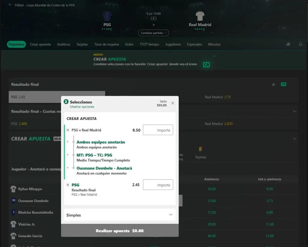 Imagen: ejemplo de menú “Crear apuesta” (Bet Builder) para PSG vs Real Madrid del 9 de julio 2025 a jugarse por el mundial de clubes.