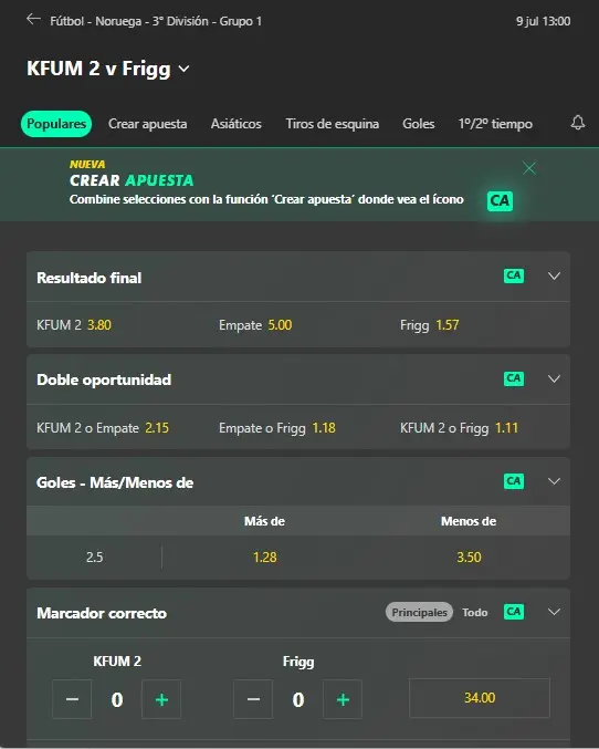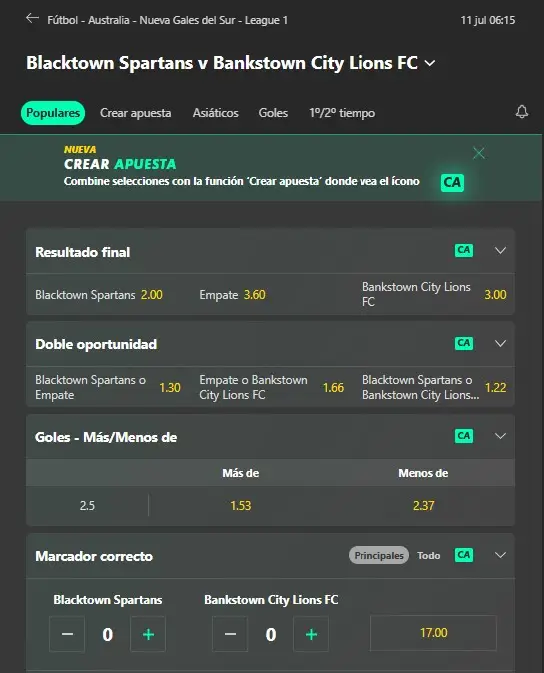 Además, dentro el mismo menú anterior Bet365 tiene la opción de “Crear apuesta” (Bet Builder), donde también podrán realizar apuestas combinadas para los mercados disponibles en el partido en cuestión.