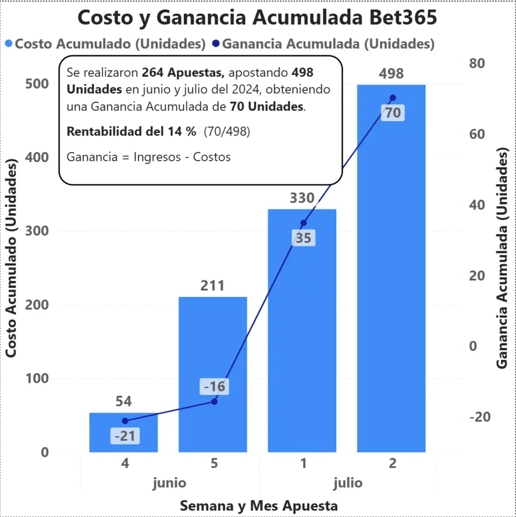 En el gráfico de abajo se muestra la evolución semanal del Costo y la Ganancia Acumulada de las apuestas realizadas para esta reseña, alcanzando una Rentabilidad del 14% y una Ganancia Acumulada de 70 unidades.