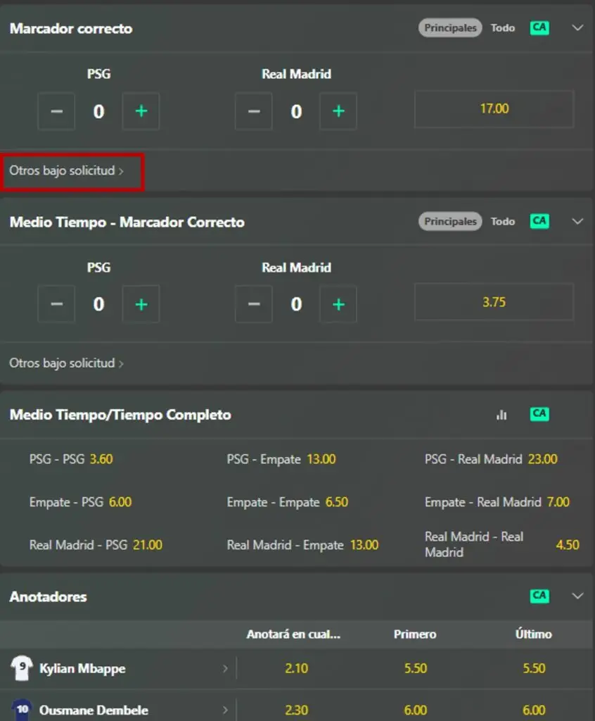 Imagen: ejemplo de apuesta combinada para el partido PSG vs Real Madrid del 9 de julio 2025 a jugarse por el mundial de clubes.  Para este ejemplo, el boleto de apuestas no me permitió agregar la selección “PSG Resultado final” ya que esta selección entraba en conflicto la selección “MT: PSG – TC:PSG” (Medio Tiempo: PSG – Tiempo Completo: PSG) por ser parcialmente duplicada.