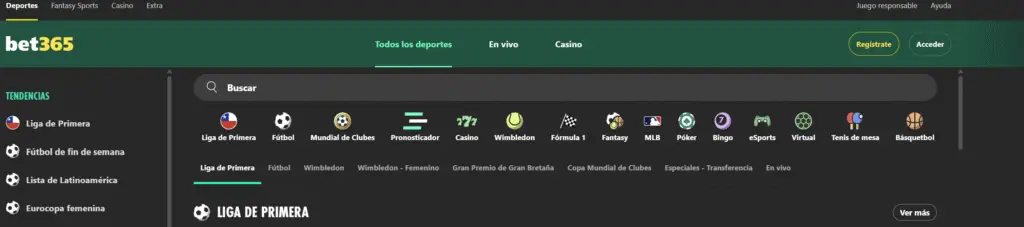 En este aspecto Bet365 destaca muchísimo.  Bet365 tiene disponibles para realizar apuestas desde los deportes más populares (Fútbol, Béisbol, Básquetbol, Tenis, etc.) hasta los deportes mas de “nicho” (Dardos, Sumo, Lacrosse, etc.).  Además, tiene disponibles una variedad muy amplia de ligas, desde ligas profesionales hasta ligas amateur.