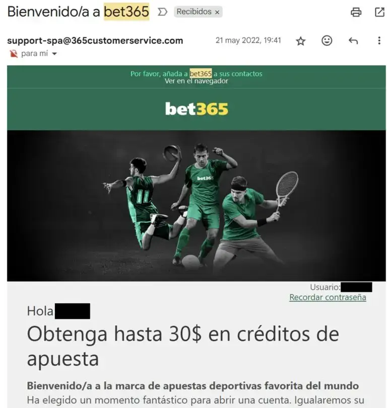 Imagen: Correo enviado por Bet365 al crearse mi cuenta el 21 de mayo del 2022.