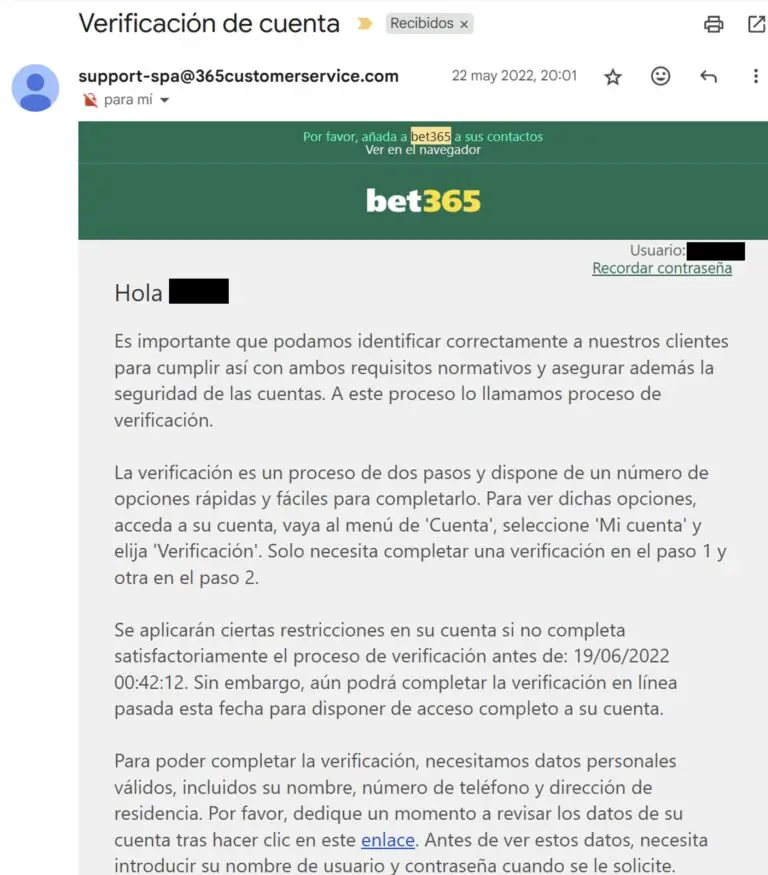 Imagen: Correo enviado por Bet365 el 22 de mayo del 2022 solicitando la verificación de mi cuenta, un día después de haberla creado.