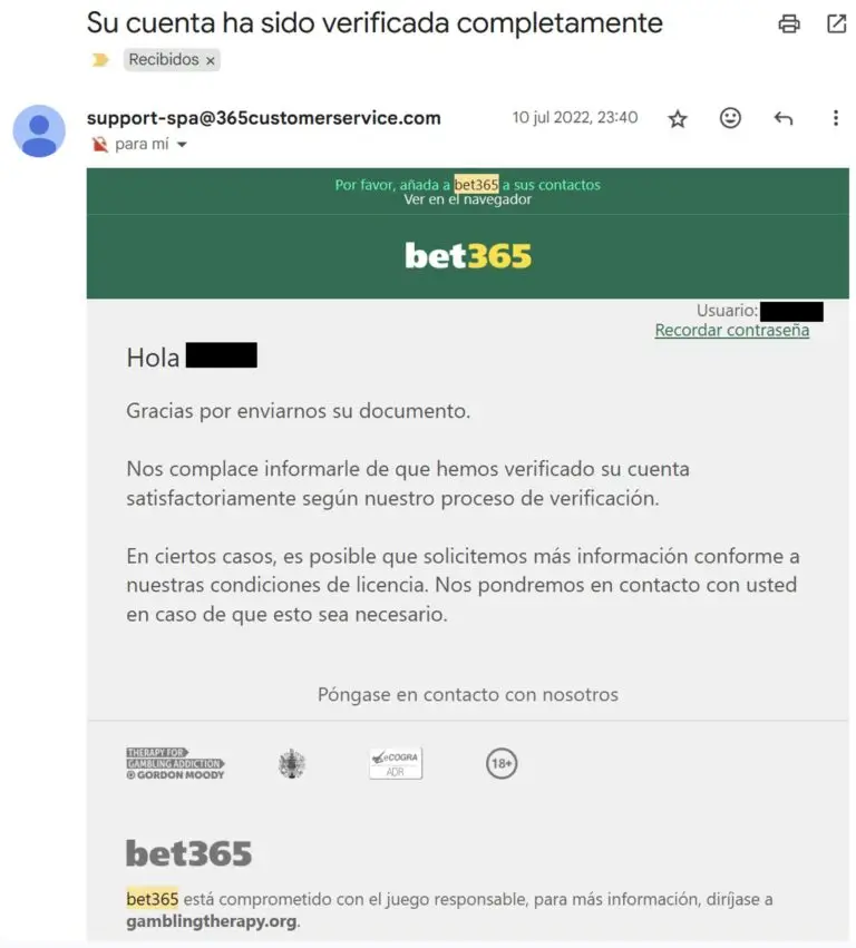 Imagen: Correo enviado por Bet365 el 10 de julio del 2022, indicándome que mi cuenta ha sido satisfactoriamente verificada.