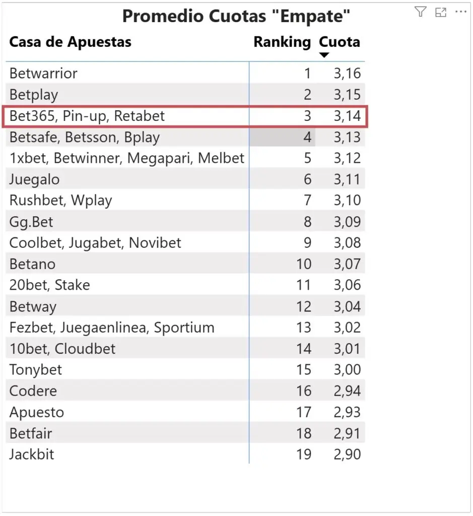 Cuotas “Empate”: Bet365 ocupó el puesto Nº 3 (19 valores distintos de cuota para empate, Bet365 en tercer lugar).