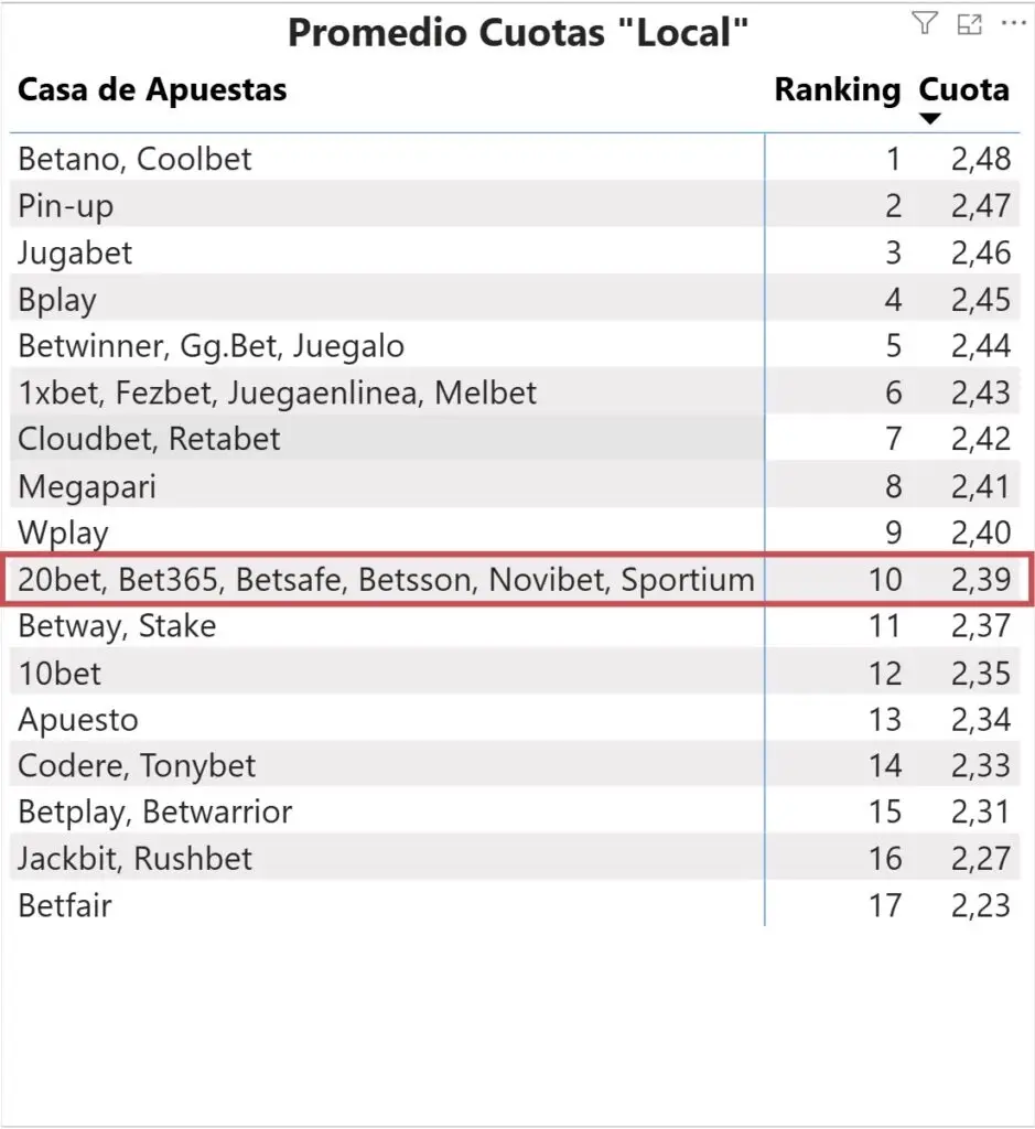 Cuotas “Gana Local”: Bet365 ocupó el puesto Nº 10 al compararla con otras casas de apuestas (hubo 17 valores distintos de cuota en el mercado de gana local, y Bet365 se ubicó en la décima posición).