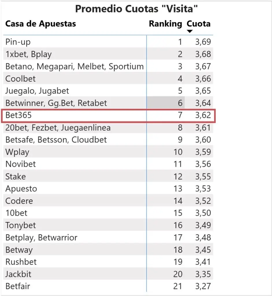 Cuotas “Gana Visita”: Bet365 ocupó el puesto Nº 7 (21 valores distintos de cuota de victoria visitante, Bet365 en séptimo lugar)..