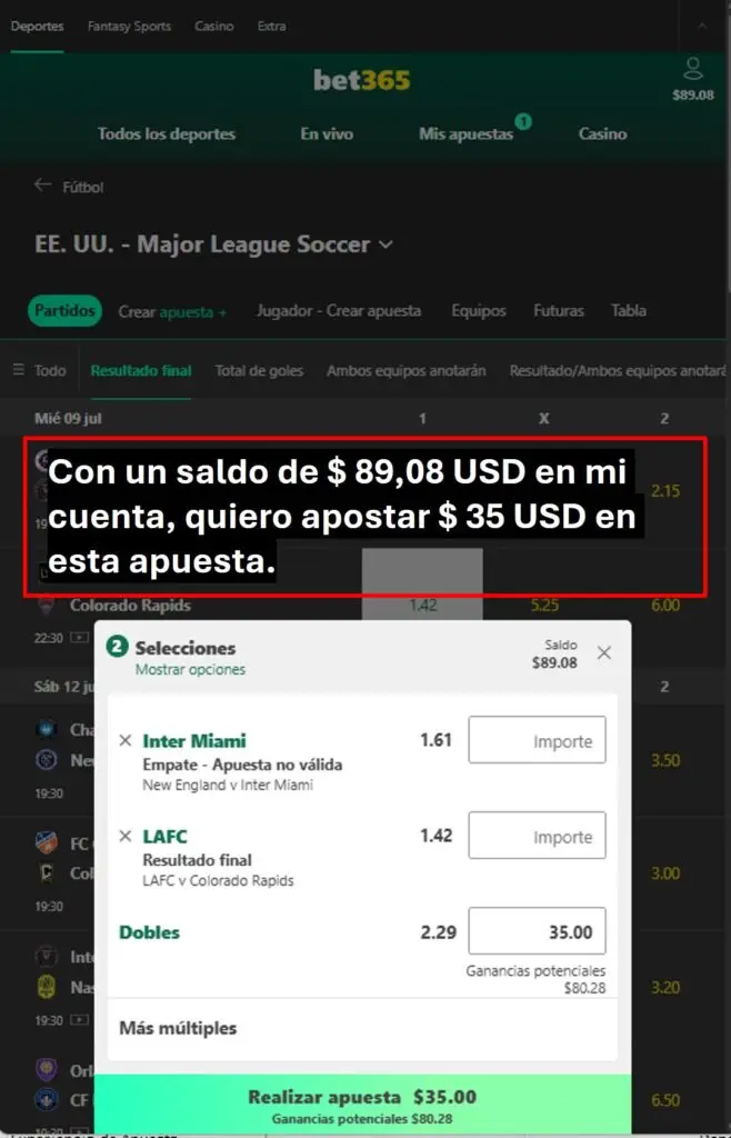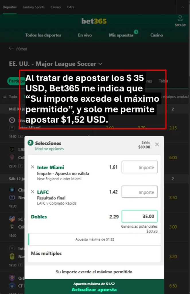 Ilustraré las restricciones del monto a apostar en Bet365 con el siguiente ejemplo.  El día 07 de julio del 2025 traté de hacer una apuesta combinada con dos partidos de la Major League Soccer de EE. UU.  Mi saldo en Bet365 al momento de tratar de hacer la apuesta era $ 89.08 USD, y deseaba apostar un monto de $ 35 USD.  Sin embargo, al momento de colocar la apuesta, Bet365 me indica que “Su importe excede el máximo permitido” y solo me permite apostar $1.52 USD. Abajo ilustro en 2 imágenes esta situación: