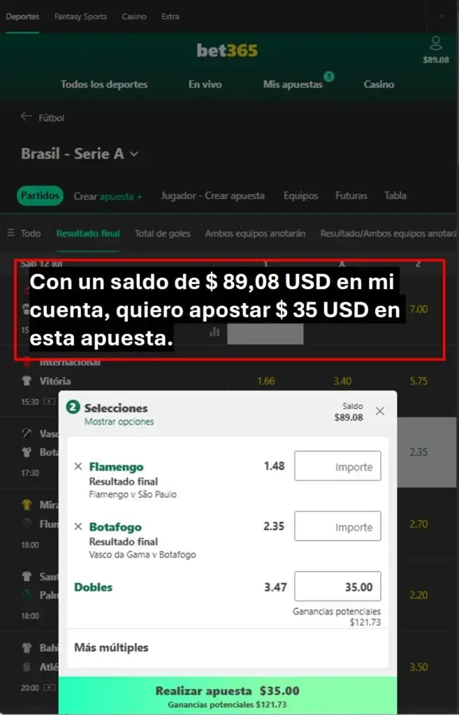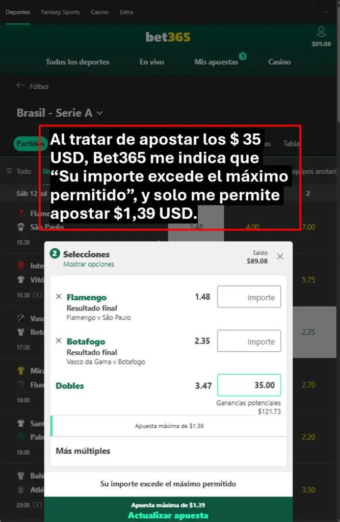 Abajo ilustro otro ejemplo, cuando el día 07 de julio del 2025 traté de hacer una apuesta combinada con dos partidos de la Serie A de Brasil.  Deseaba apostar un monto de $ 35 USD.  Sin embargo, al momento de colocar la apuesta, Bet365 me indica que “Su importe excede el máximo permitido” y solo me permite apostar $1,39 USD. Abajo ilustro en 2 imágenes esta situación: